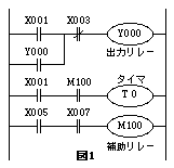シーケンサへのプログラム入力時に作成するのが、ラダー(梯)チャートです。(図1) チャートの横線上に、リレー、タイマーを配置し、上から順に実行させるためのプログラムをシーケンサのRAMへ転送します。 ラダーの1.2段に注目して下さい。Xが入力、Yが出力です。押しボタンスイッチX001(押している間だけONになるA接点)を押すと、出力リレーY000のリレースイッチY000が励磁され、X003(押している間だけOFFになるB接点)を押して回路を切断するまで、主力リレーY000がONになり続けます。これがシーケンス制御特有の自己保持回路(lock up circuit)といわれる動作です。
